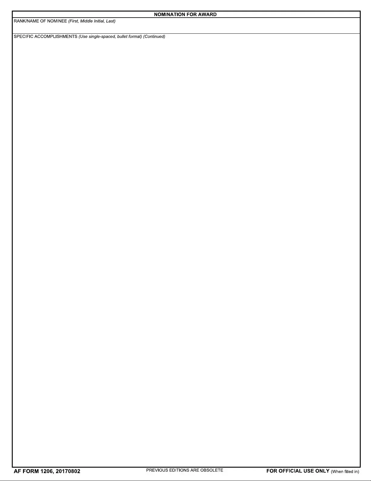 Any member of the U.S. Air Force who meets the eligibility criteria for a specific award can be nominated using the AF Form 1206. This includes active duty personnel, reservists, and members of the Air National Guard, provided they have made significant contributions that warrant recognition.