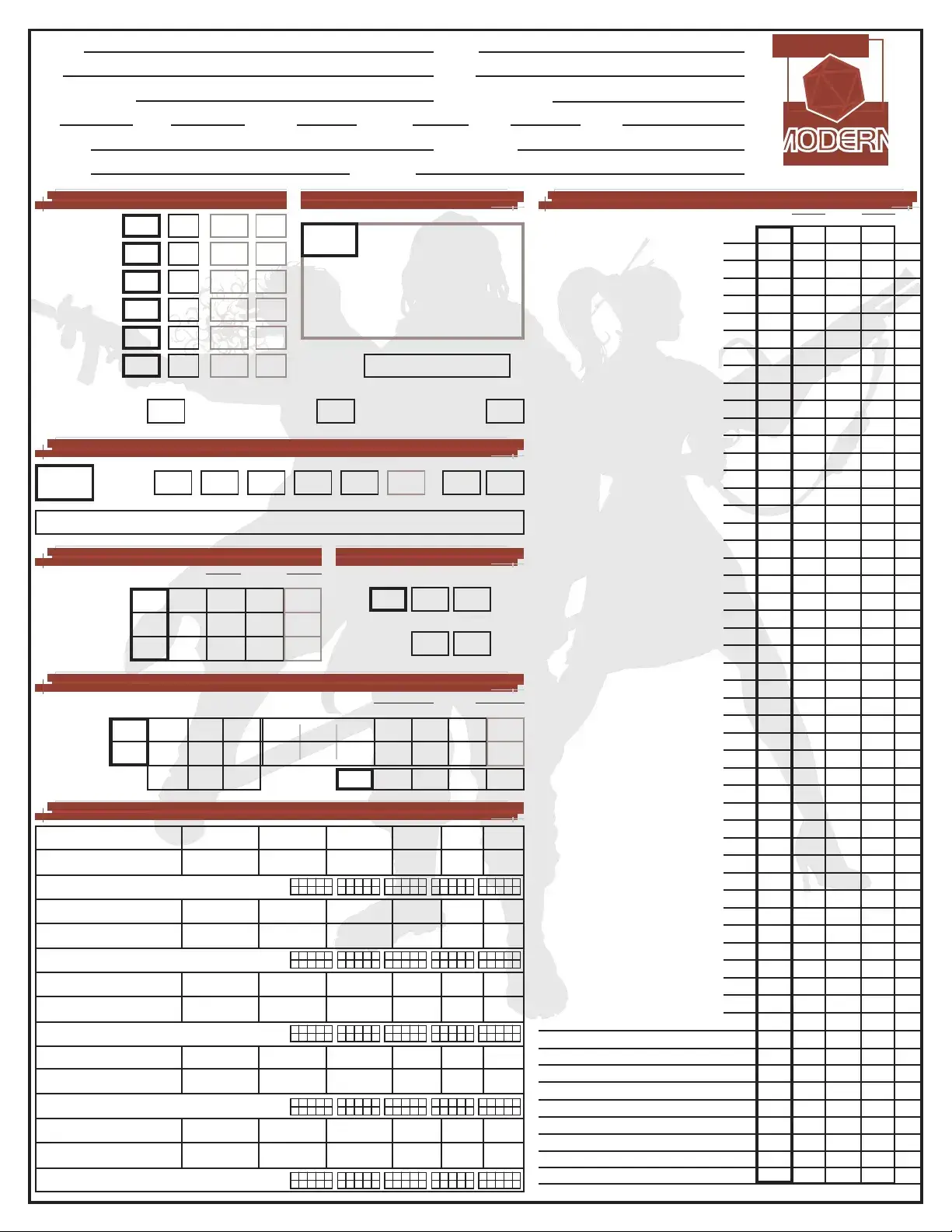 Another document akin to the D20 Modern Sheet is the Pathfinder character sheet. Pathfinder builds upon the D&D framework, offering a similar layout that includes character stats, skills, and equipment. Like the D20 Modern Sheet, it allows players to record their character's abilities and track experience points. The Pathfinder sheet also emphasizes customization, allowing for a detailed representation of a character's unique traits and abilities, reflecting the same need for organization and clarity as the D20 Modern Sheet.