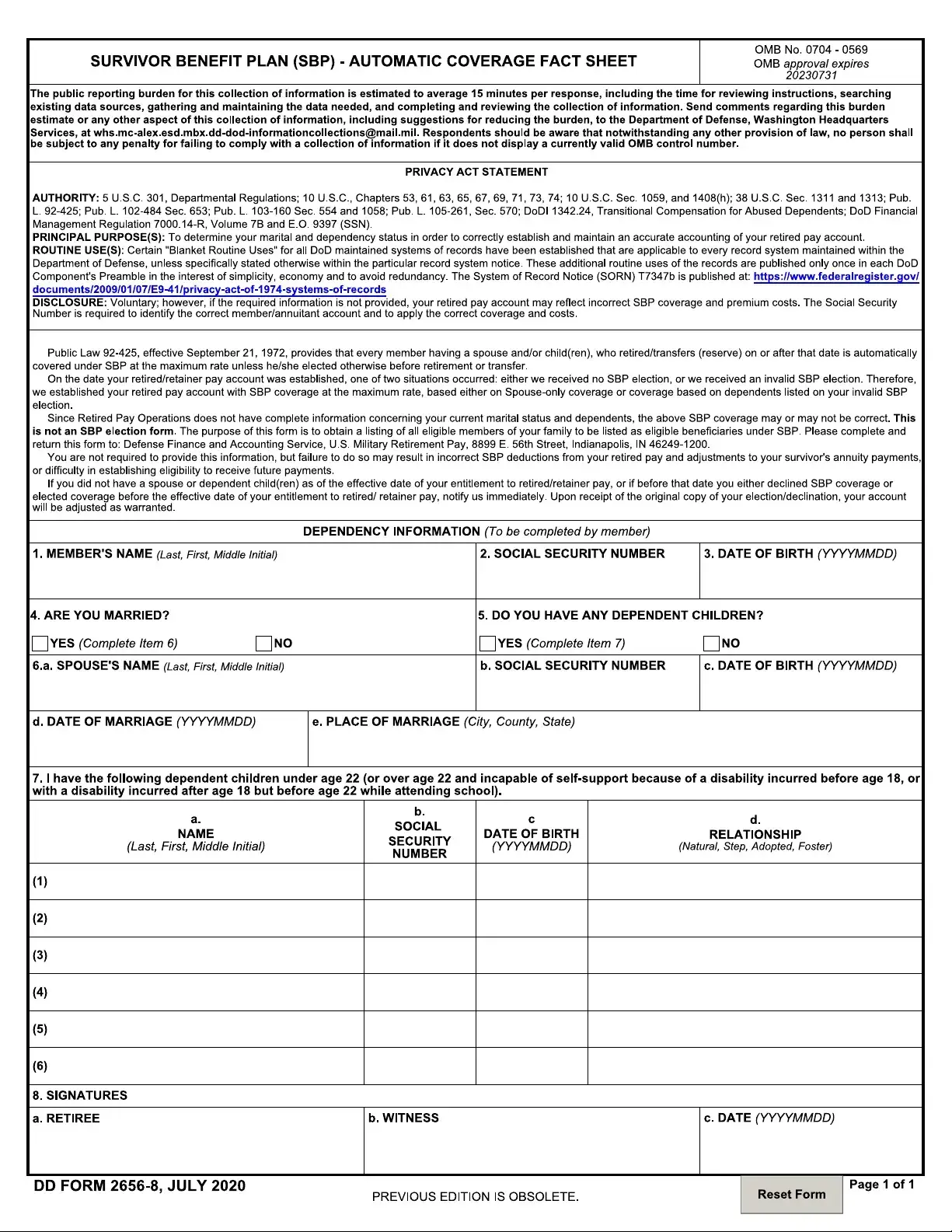 The DD Form 2656, which is the basic Survivor Benefit Plan Election form, directly relates to the DD 2656-8. While the latter focuses on automatic coverage and dependency information, the former is used to make specific elections regarding SBP coverage. Both forms are critical in ensuring that service members and their families receive the appropriate benefits after retirement. They underscore the importance of making informed decisions about coverage options and maintaining accurate records of family status.