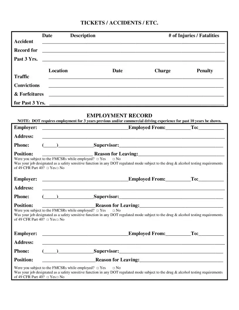 If you require additional space to complete your employment history, simply request another sheet. Ensure you provide all necessary information for each employer, as the Department of Transportation (DOT) requires a complete record.
