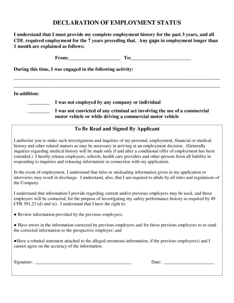 You will need to provide personal information such as your name, current and previous addresses, phone number, date of birth, and Social Security number. Additionally, you must include details about your driver’s license, including the state, license number, type, and expiration date. Employment history for the past three years is also required, along with any relevant commercial driving experience from the past ten years.