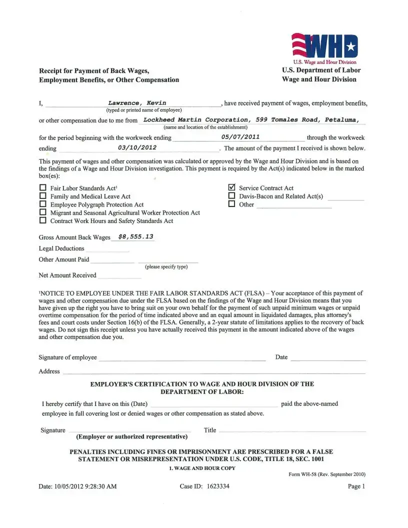 The WH-58 also shares similarities with the WH-12 form, which is a request for an investigation into wage and hour violations. The WH-12 initiates the process of seeking unpaid wages, while the WH-58 concludes it by documenting the payment made. Both forms play a significant role in the enforcement of labor laws, allowing employees to navigate the complexities of wage disputes effectively.